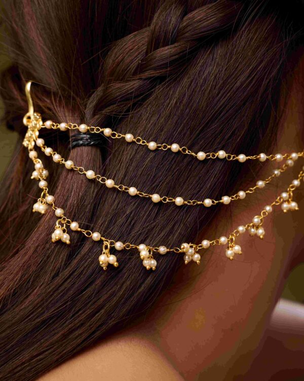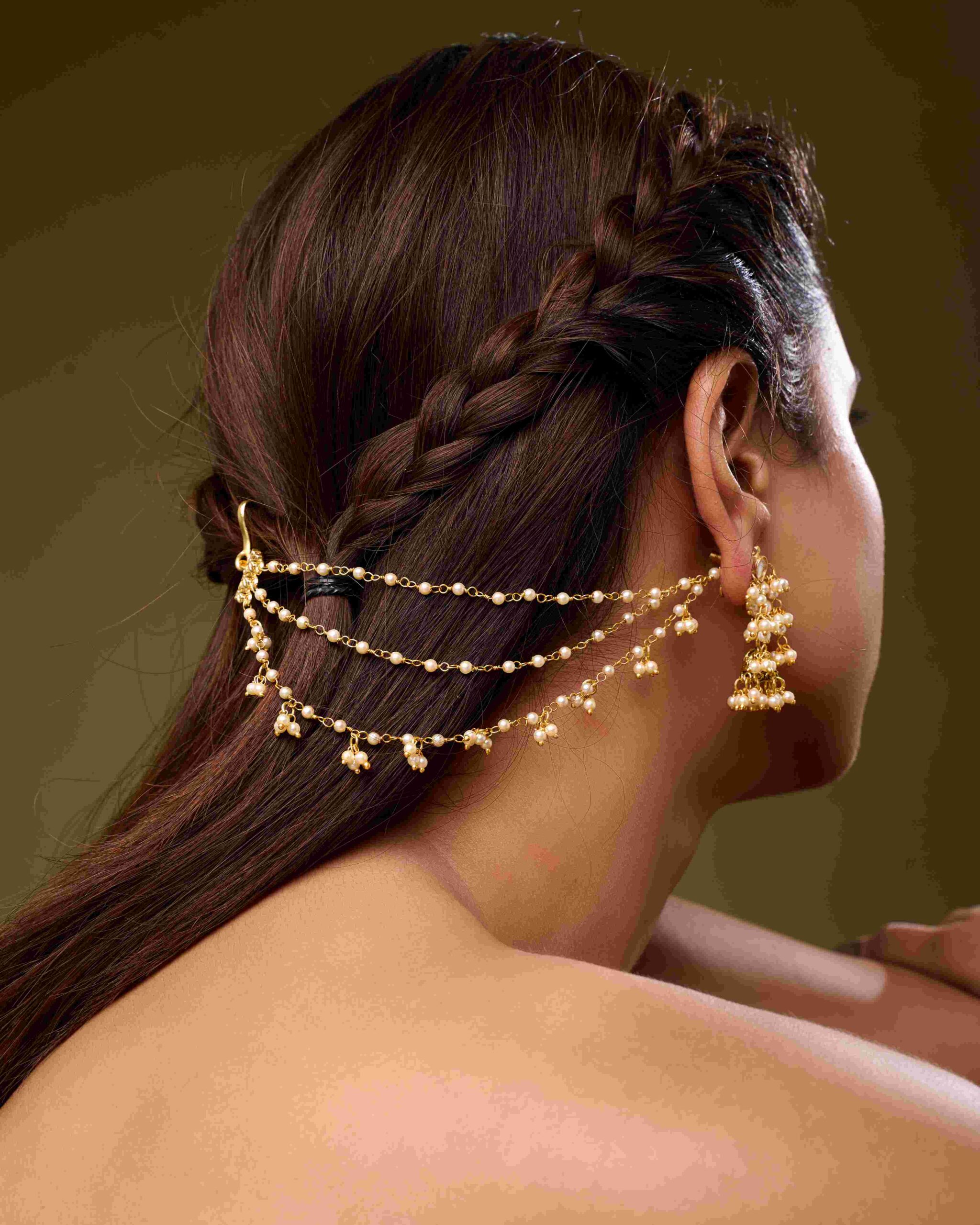The 3 Layer Earchain is a statement accessory that beautifully combines luxury and sophistication. Featuring three delicate layers of pearls accented with golden pearl beads, it creates a layered, dimensional look that drapes gracefully along the ear.