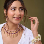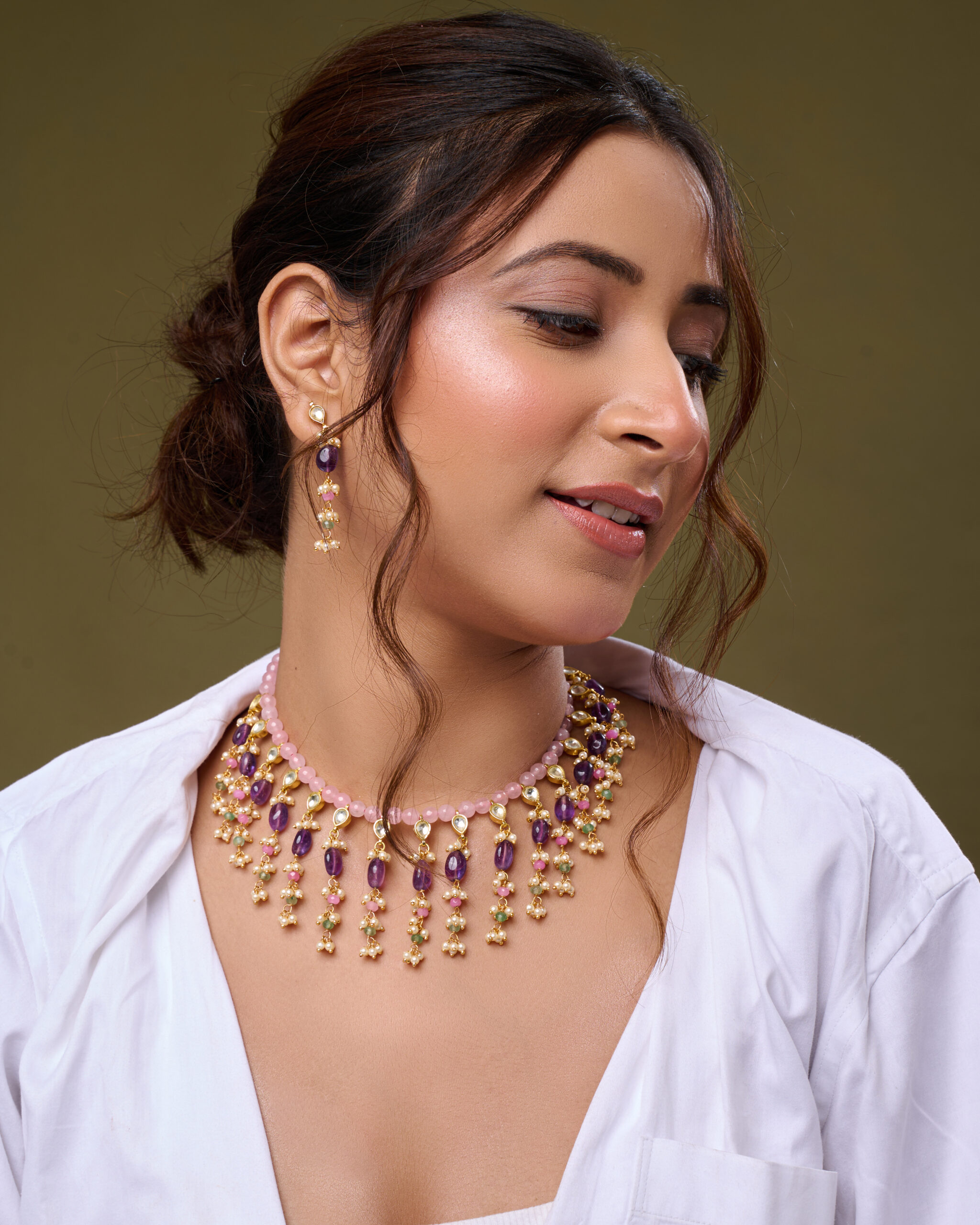 The Amarisse Necklace is a statement piece that effortlessly blends sophistication with vibrant charm. Featuring graceful rose quartz beads accented with white kundan and delicate hanging amethyst drops, this necklace set creates a harmonious and eye-catching design.