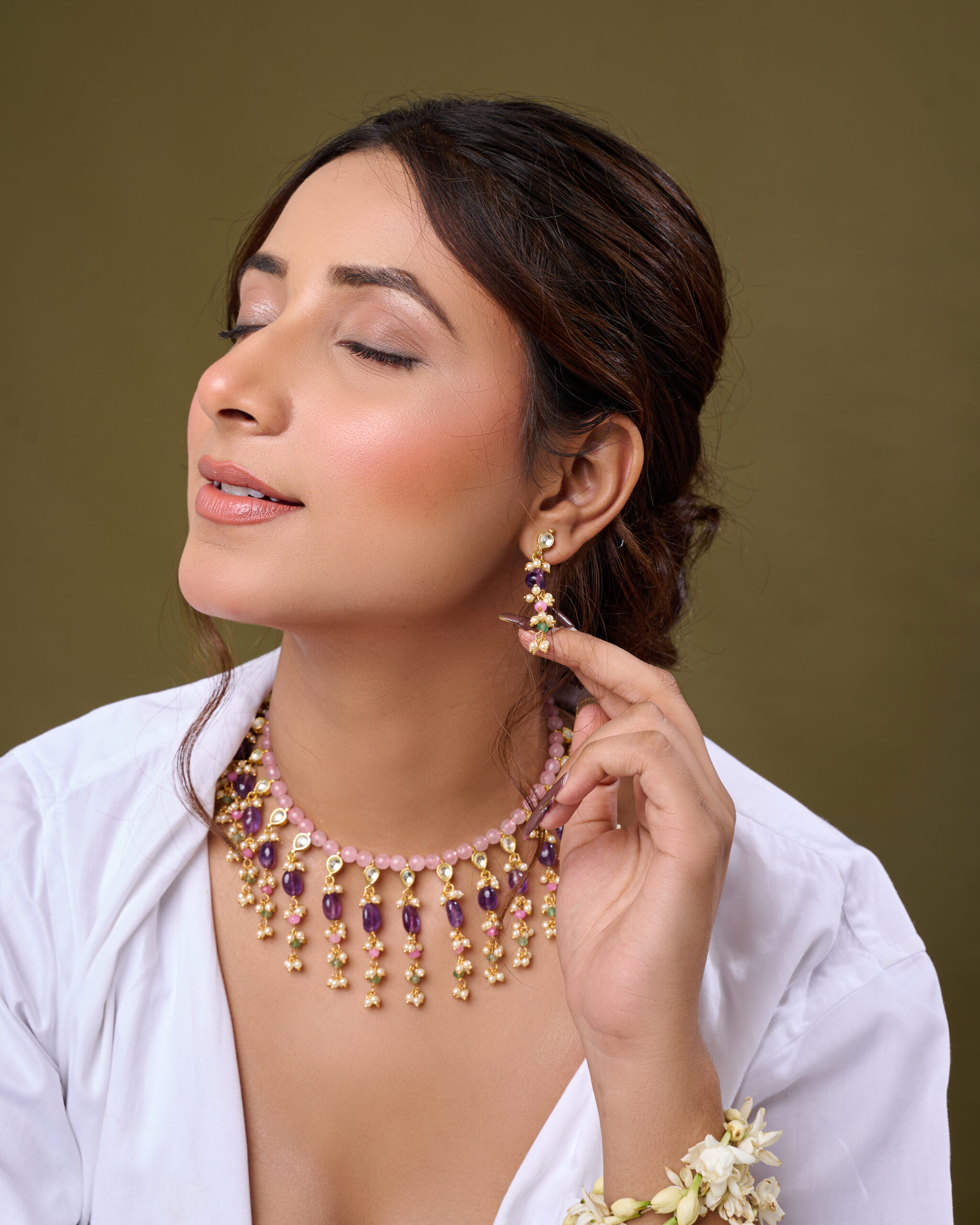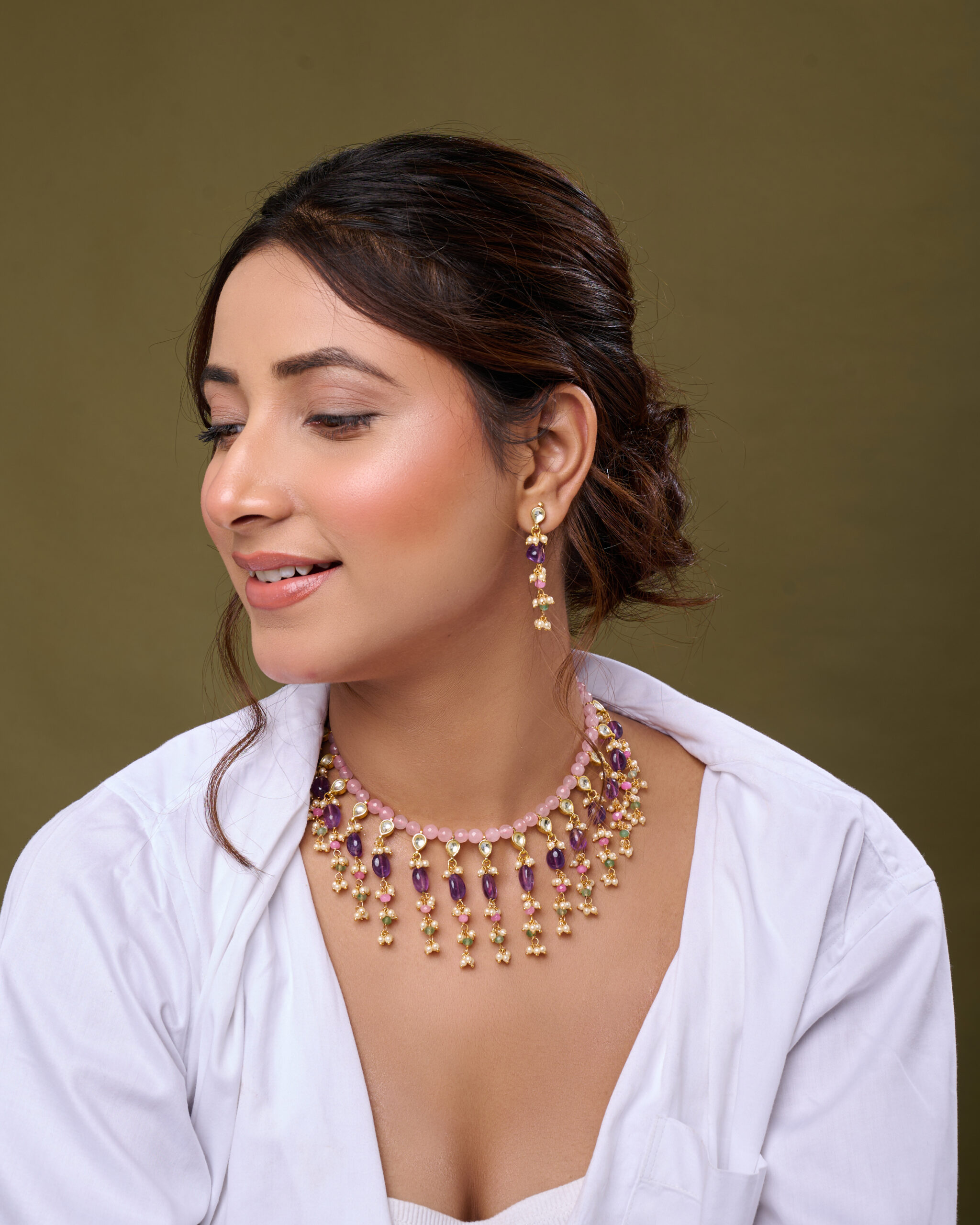 Material: Rose quartz beads, white kundan, amethyst drops, alloy base