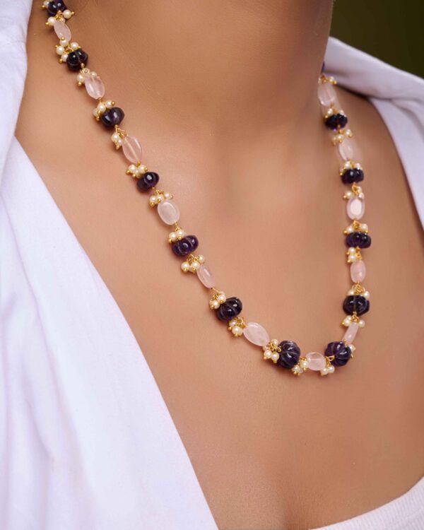 The Amethyst Purple Bloom Necklace is a graceful blend of vibrant hues and timeless charm. Crafted with rich purple pumpkin-shaped beads and delicate pink beads, this single-layer necklace exudes a refreshing, youthful elegance. The contrast of deep purple and soft pink creates a blooming effect, reminiscent of spring blossoms in full glory.