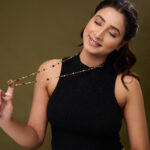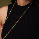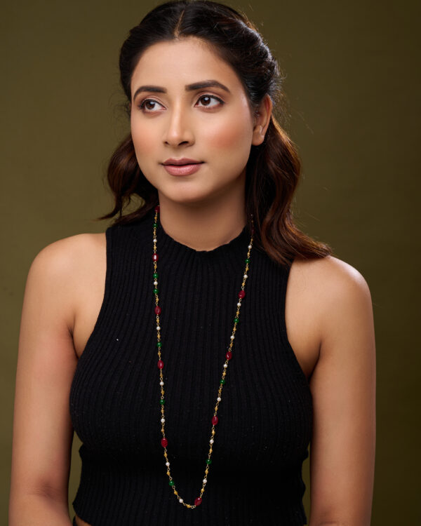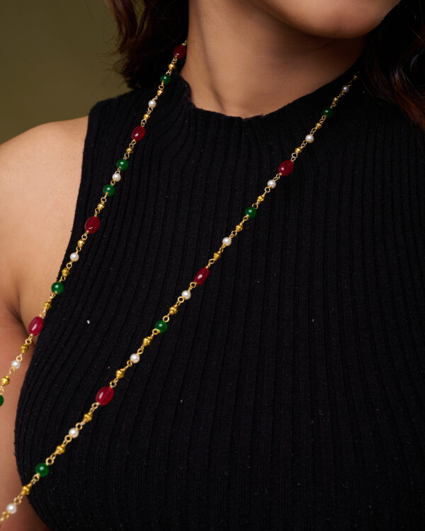 The Auric Bloom Necklace String is a sophisticated accessory that combines traditional charm with contemporary style. Featuring lustrous pearls blended with green and red beads in a sleek single-line design, this mala offers a subtle yet striking elegance.