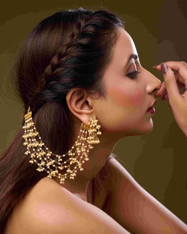 The Auric Grace Earchain is a sophisticated accessory that embodies luxury and refined craftsmanship. Featuring five layers of lustrous pearls, this earchain creates a graceful, statement-making look perfect for festive and celebratory occasions.