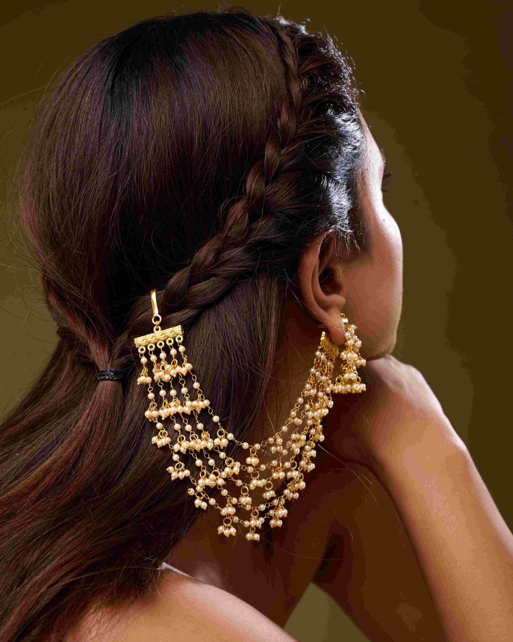 Each layer is meticulously arranged to drape elegantly along the ear, adding dimension, sparkle, and charm to your ensemble. Pair it with matching earrings or necklaces to complete a regal and stylish appearance.