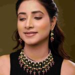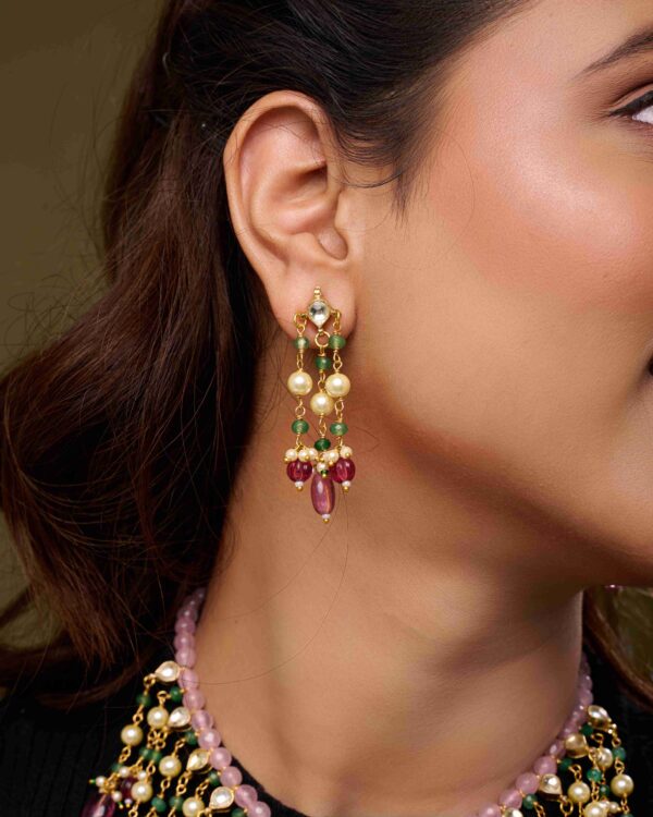 Each bead and pearl is thoughtfully arranged to create a layered design that drapes gracefully along the neckline, combining soft pastel tones with rich jewel hues for an ethereal, designer appeal. Paired with matching earrings, this set embodies contemporary elegance while honoring traditional craftsmanship.