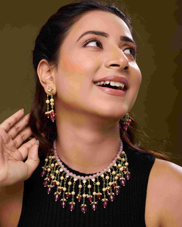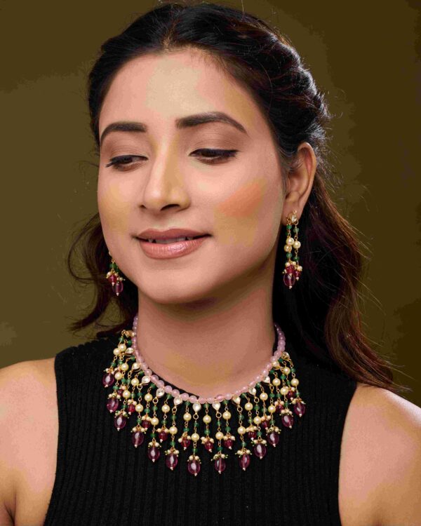 The Elysian Glow Necklace Set is a masterful blend of artistry, luxury, and vibrant charm. Handcrafted with rose quartz, rhodolite beads, and pearl kundan accents, this necklace radiates sophistication and refined beauty, making it a perfect statement piece for festive occasions and weddings.