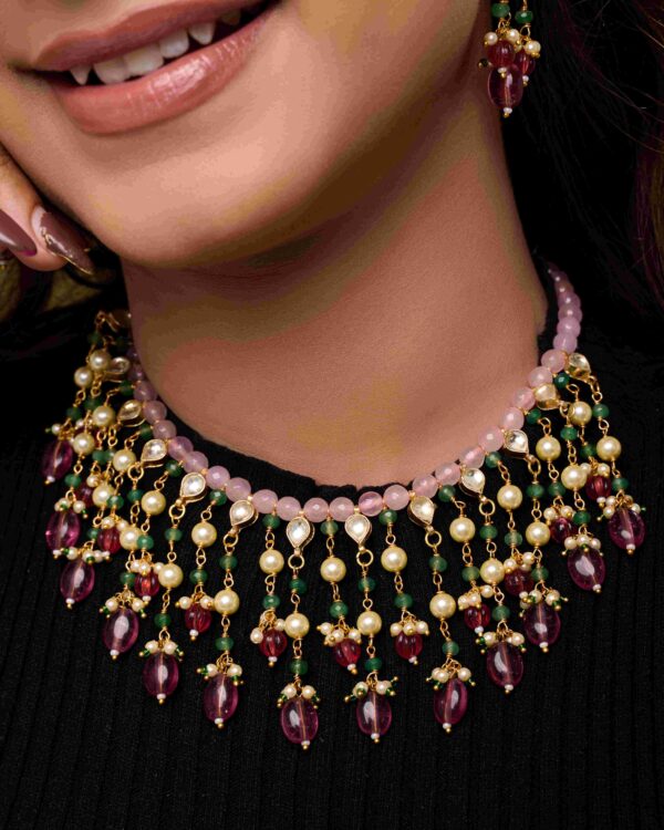 Material: Rose quartz, rhodolite beads, pearls, kundan, alloy base