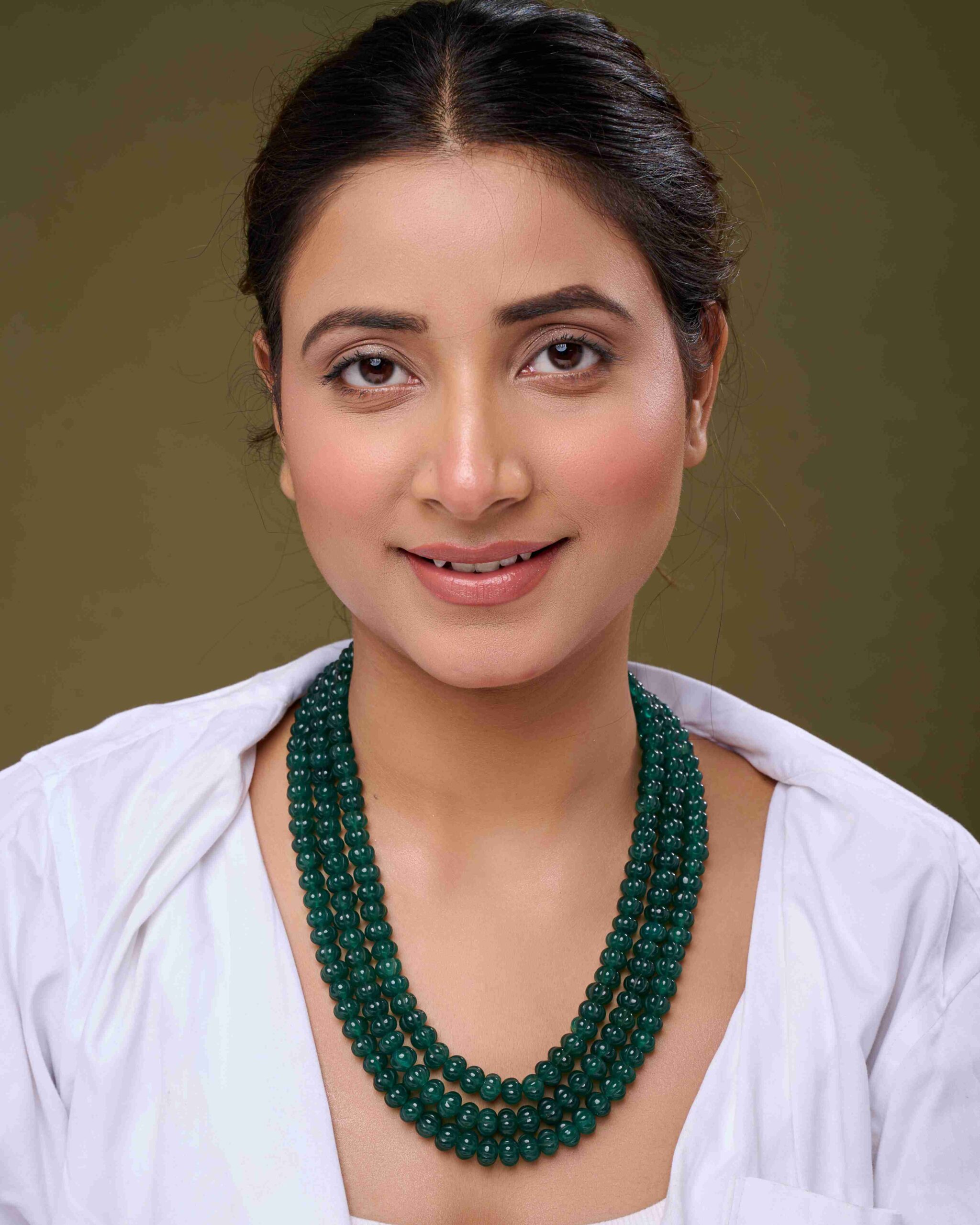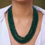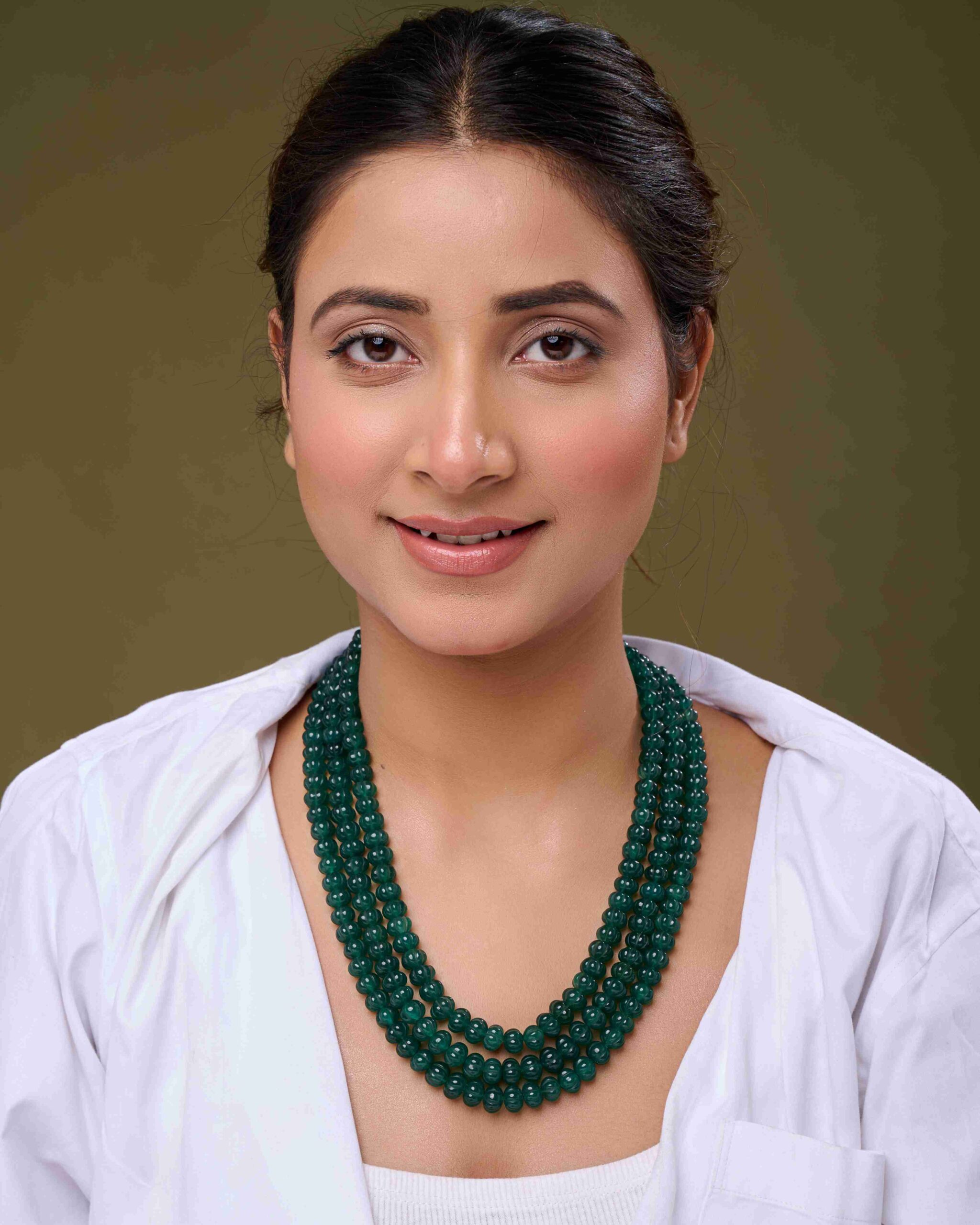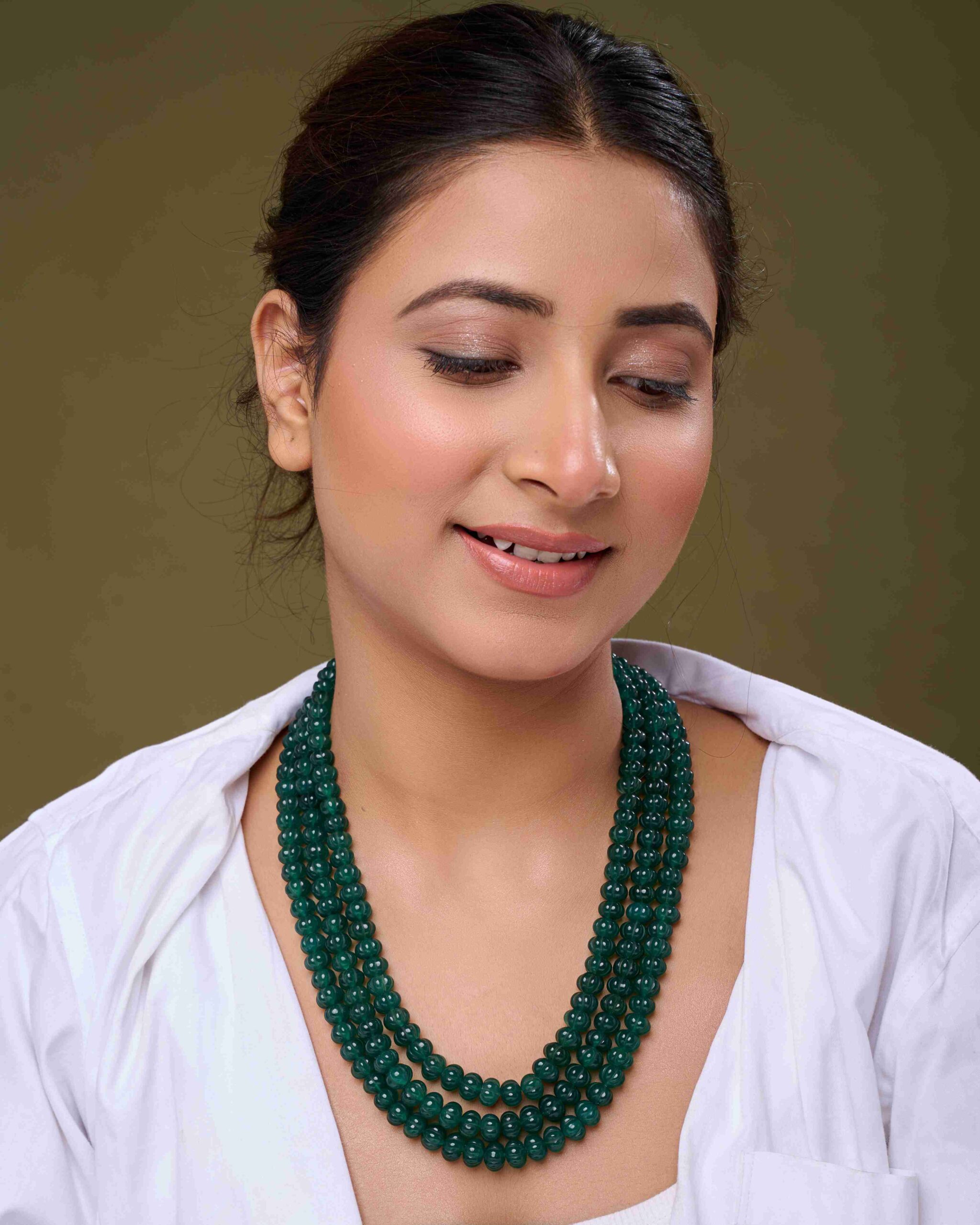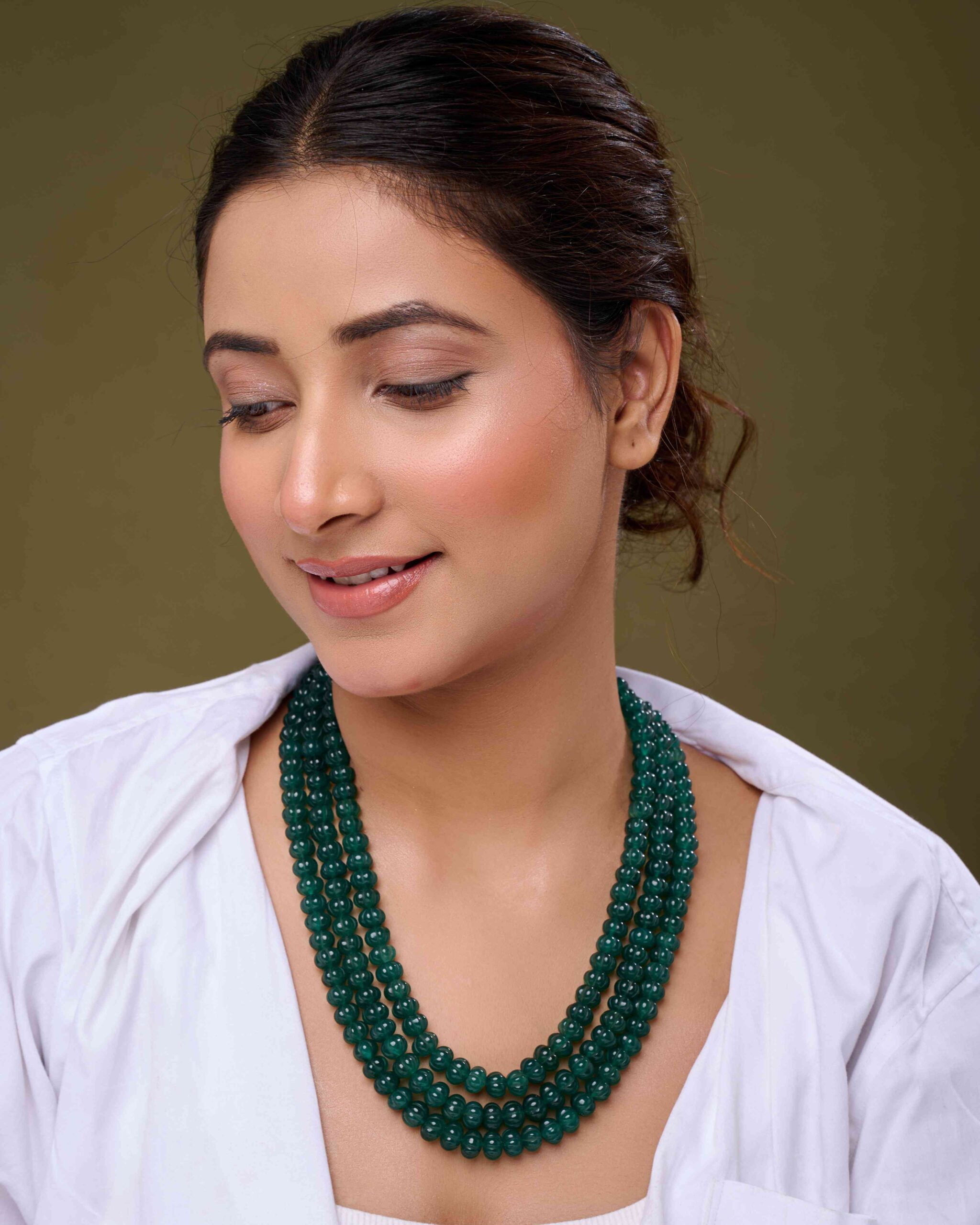 The Forest Dew Mala Necklace Set captures the serene beauty of nature with round, natural green pumpkin-shaped beads meticulously handcrafted into a three-layered necklace. Each layer drapes gracefully, reflecting the harmony and freshness of a forest morning, while exuding timeless sophistication.