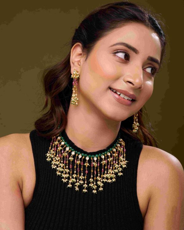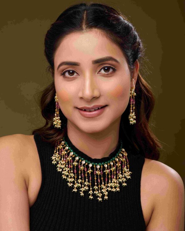 The Gemora Necklace is a celebration of color, craftsmanship, and luxury. Featuring green base beads beautifully paired with sparkling kundan, rhodolite stones, and lustrous pearls, this necklace exudes vibrant sophistication and timeless charm.