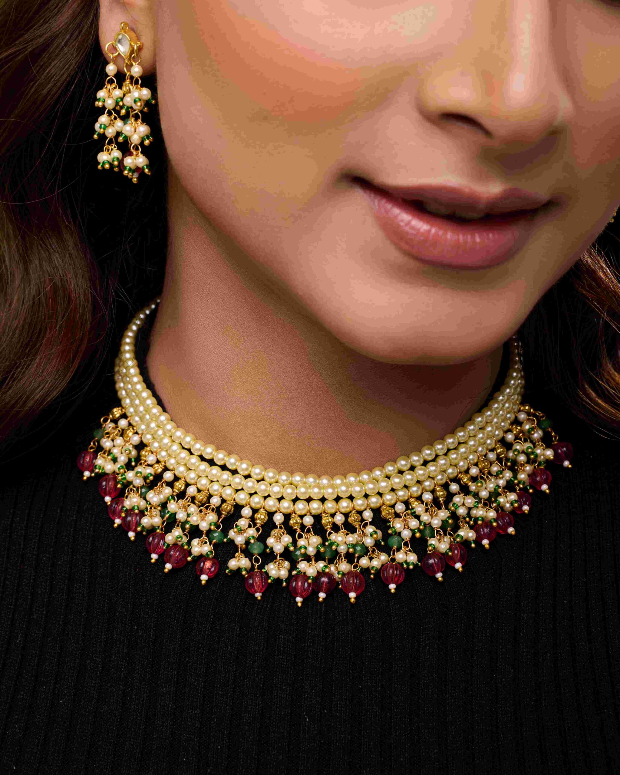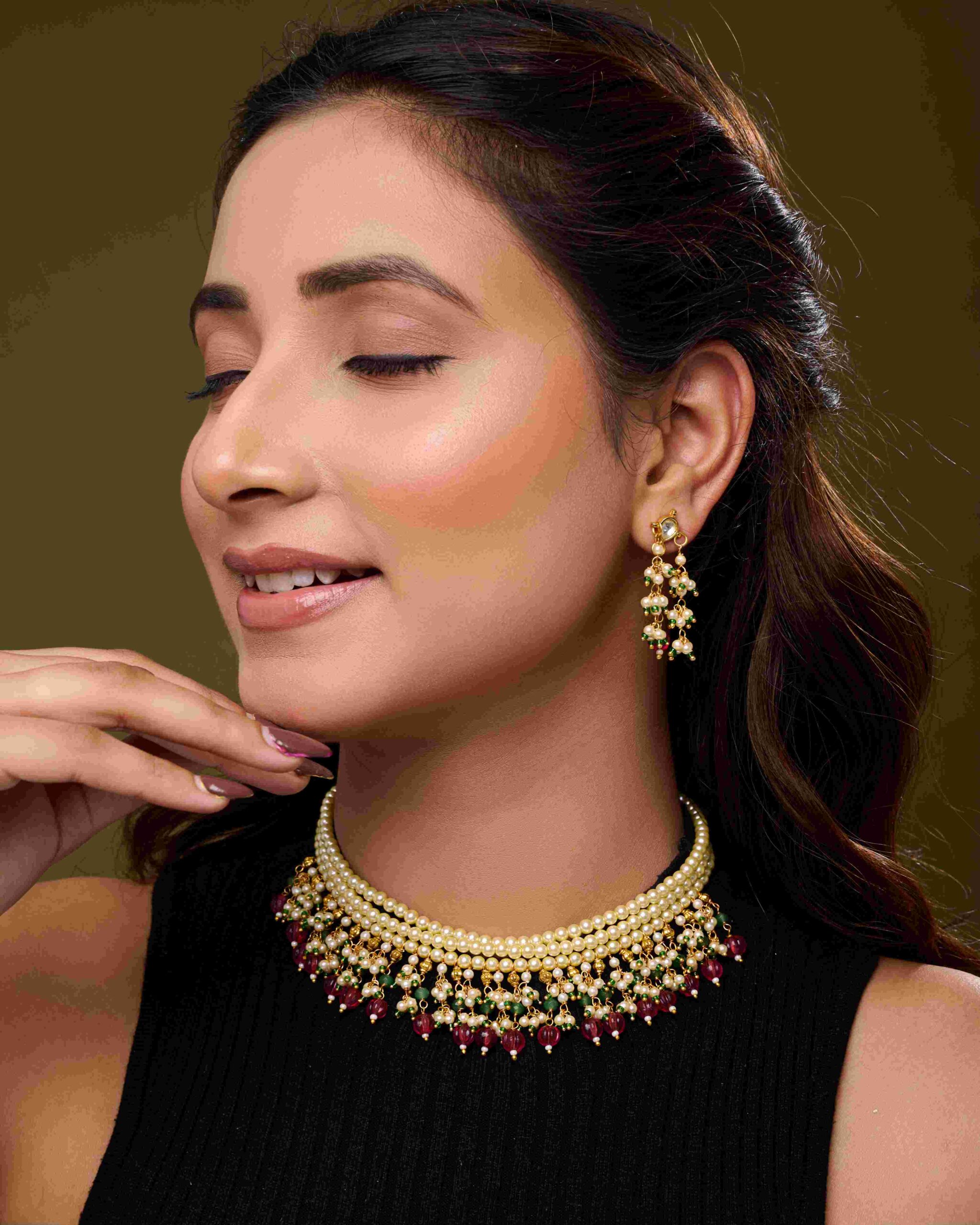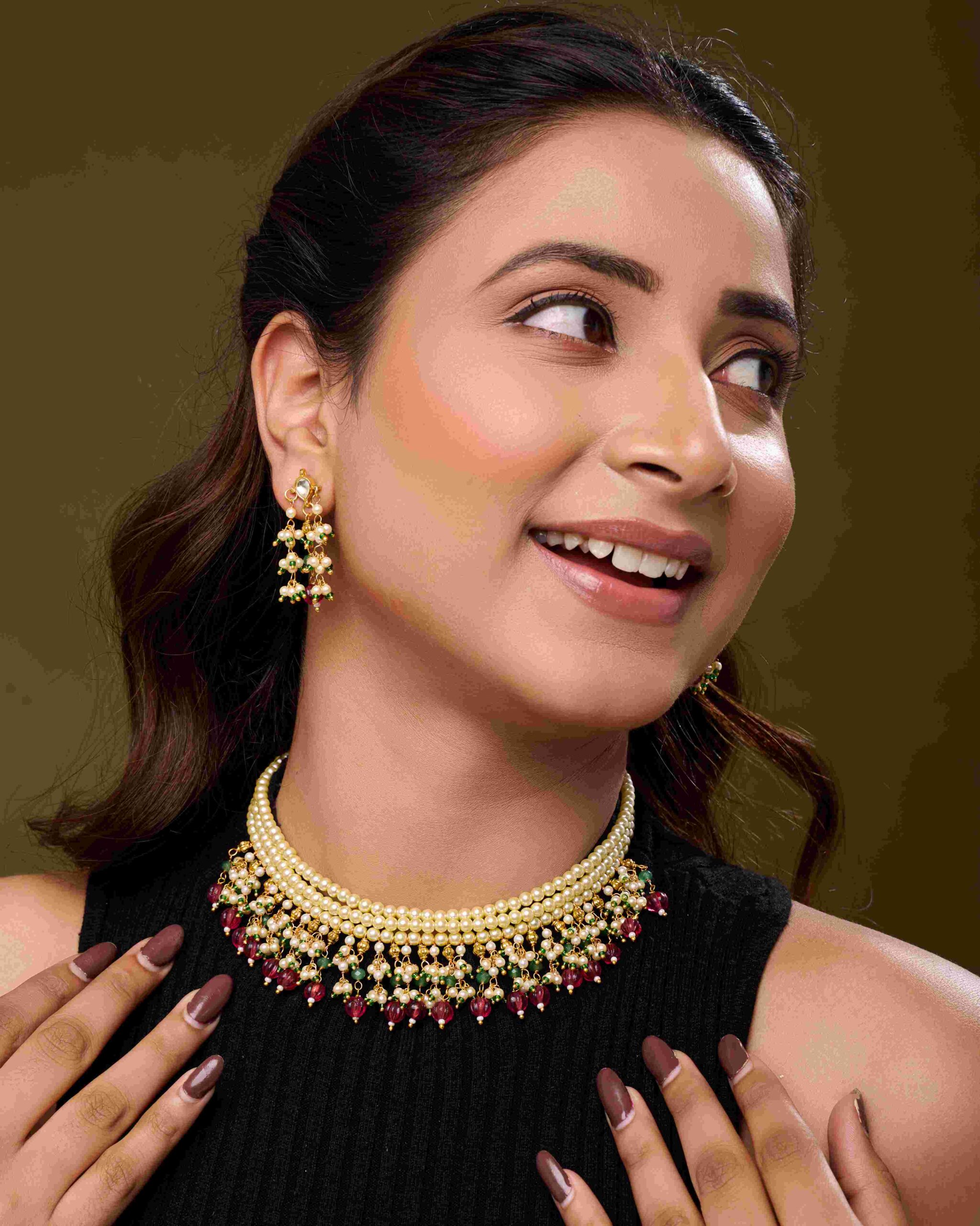 Designed to sit elegantly along the neckline, each layer is thoughtfully arranged to create depth, movement, and a luxurious appeal. Paired with matching earrings, this choker is perfect for weddings, festive celebrations, or any special occasion that calls for a standout piece of jewelry.