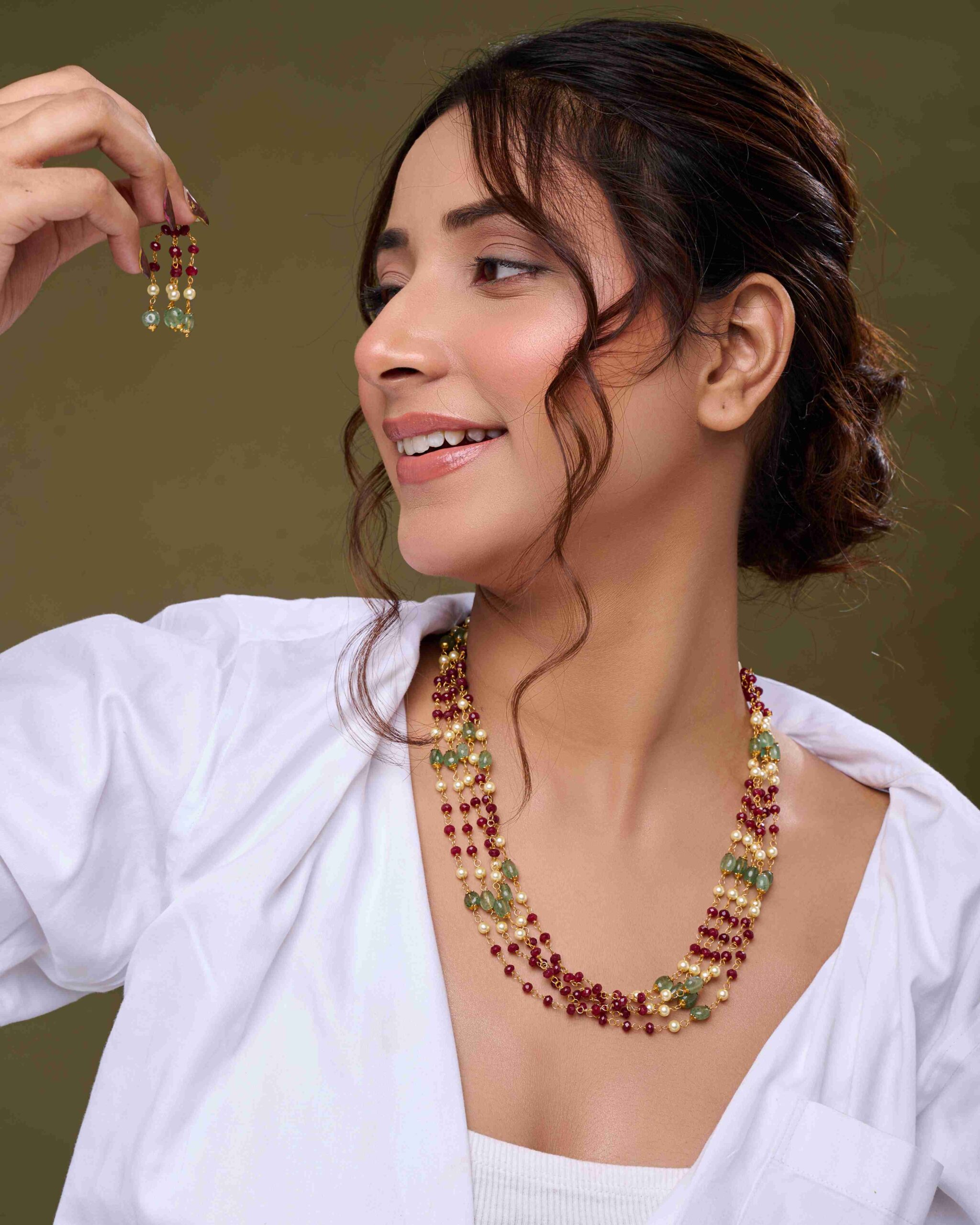 The Gul-Maroon Mala Necklace Set is a celebration of vibrant hues and refined craftsmanship. Handcrafted with strawberry green beads and maroon beads, this layered necklace creates a striking yet sophisticated contrast, perfect for festive occasions and traditional celebrations.