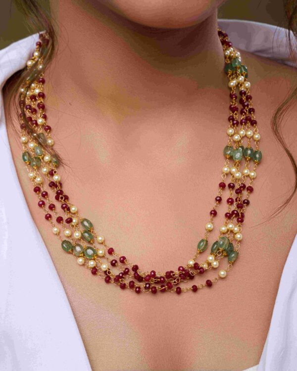Each layer is thoughtfully arranged to drape elegantly, reflecting the meticulous artistry behind the design. Paired with matching earrings, this set brings a harmonious blend of color and luxury, making it an ideal choice for weddings, festive gatherings, or cultural events.