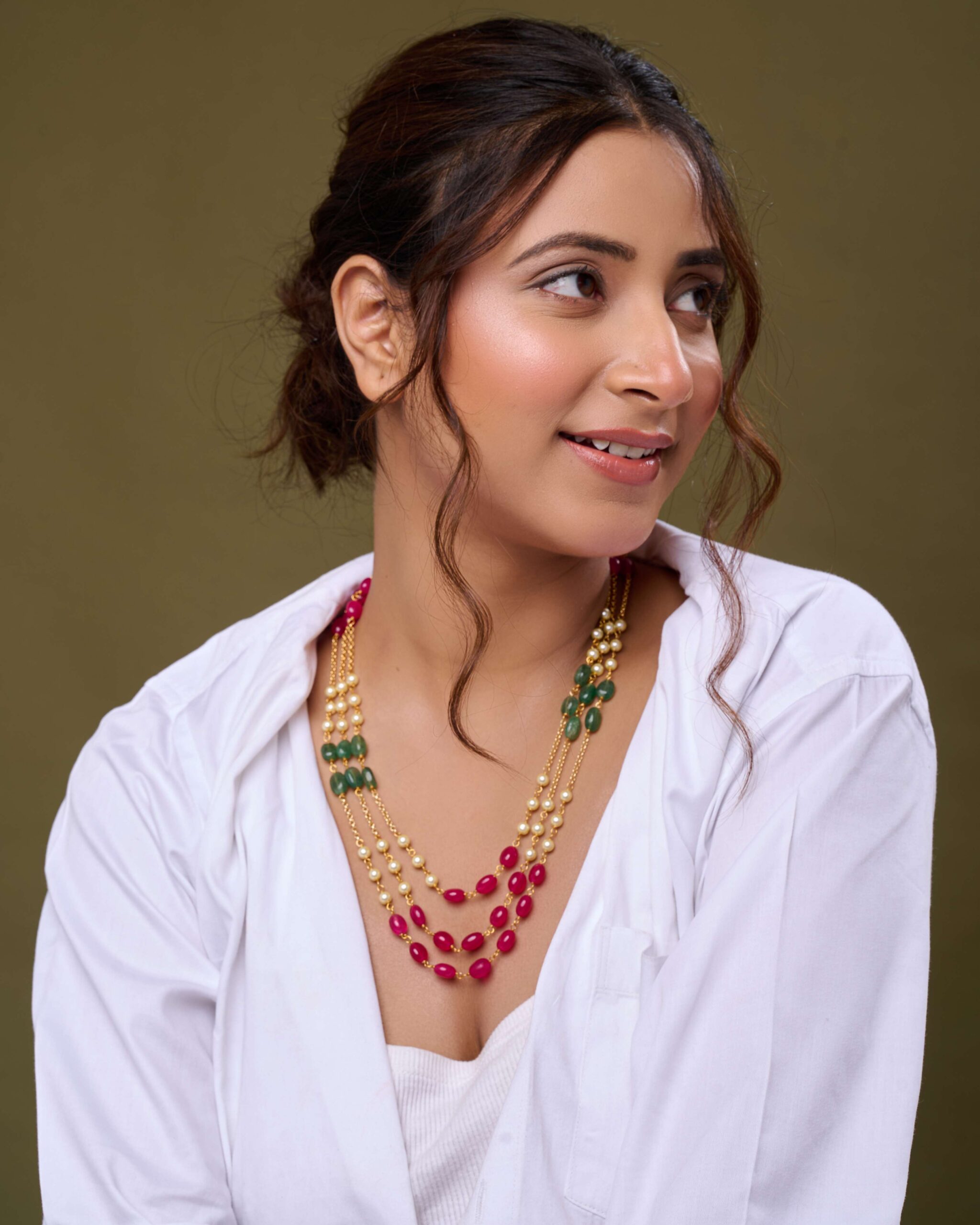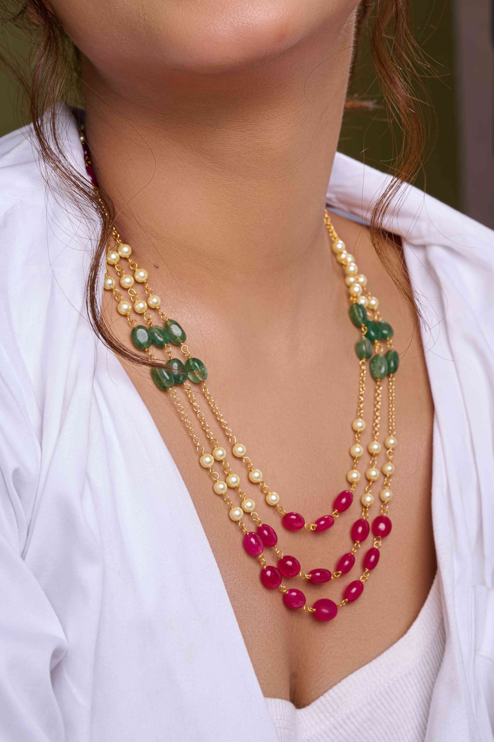 The Kanchana Mala Necklace is a vision of elegance woven in hues of charm and tradition. Featuring soft pink and vibrant green beads gracefully layered with luminous pearls, this exquisite piece exudes feminine grace and timeless allure.