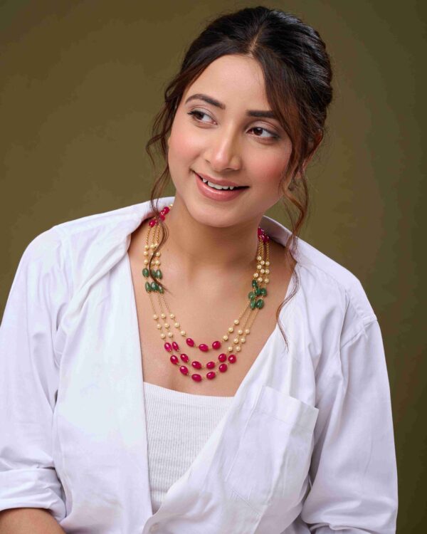 Each strand flows in perfect harmony — reflecting artistry, poise, and subtle opulence. Whether you’re dressing for a festive gathering or a grand celebration, this necklace adds a gentle radiance that enhances every look with effortless sophistication.