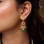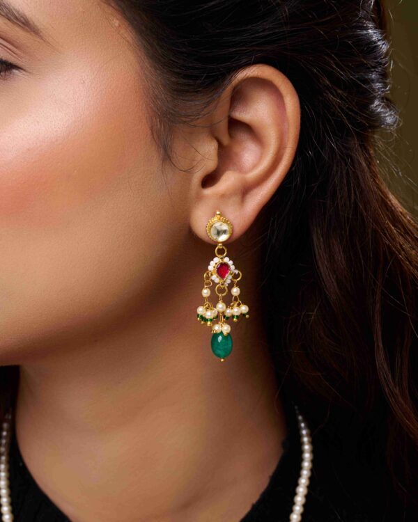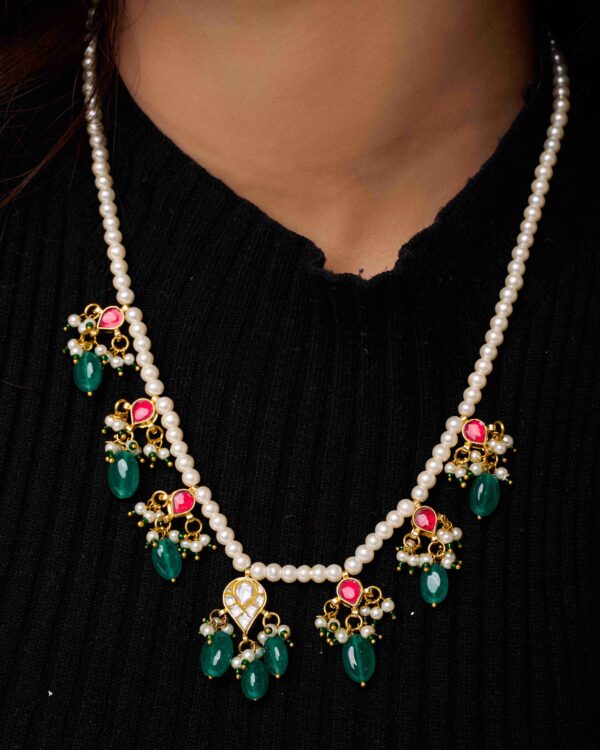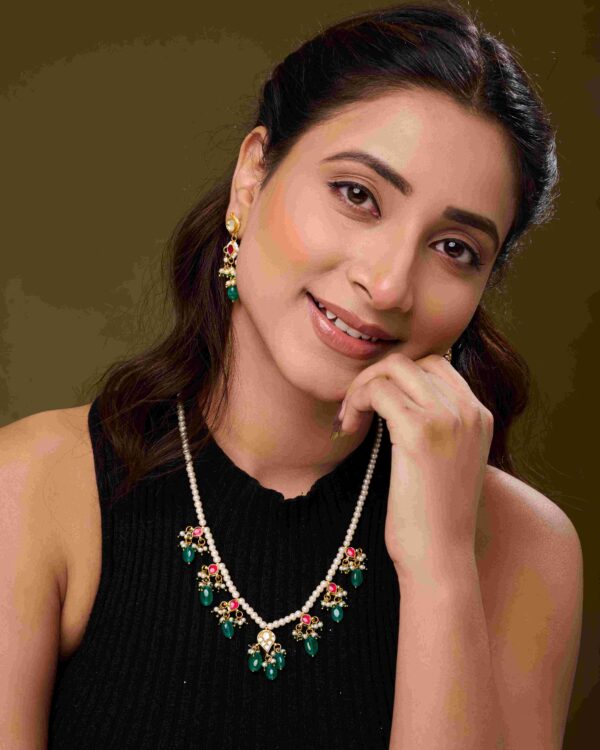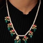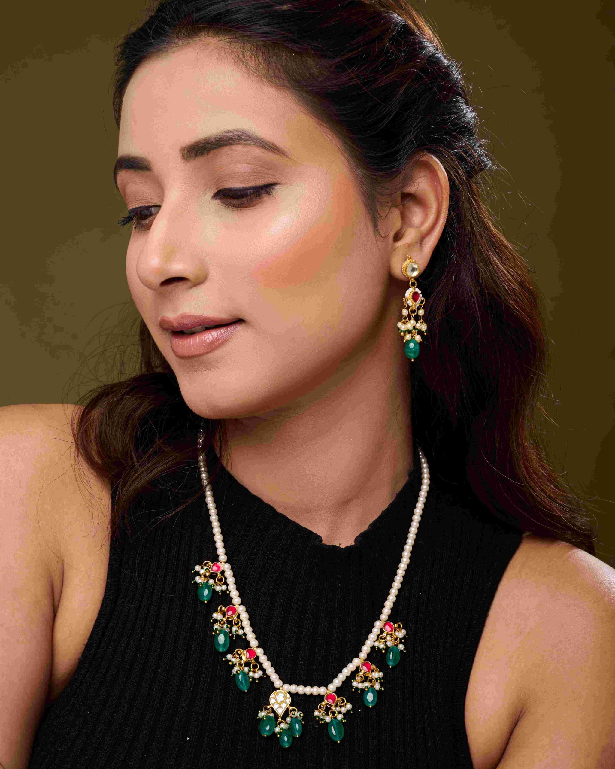 The Kundan Bloom Necklace beautifully blends pearls, red kundan, and green beads — a radiant expression of tradition and elegance, perfect for weddings and festive celebrations.
