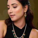 The harmonious combination of pearls, vibrant red kundan, and green beads creates a layered design that drapes gracefully along the neckline. Paired with matching earrings, this set is perfect for weddings, festive celebrations, or cultural occasions, adding a statement of opulence and artistry to your ensemble.