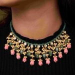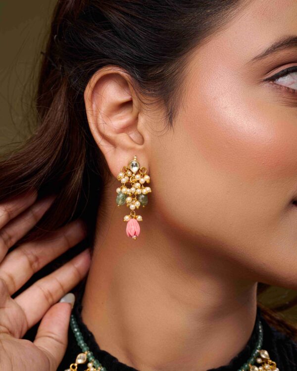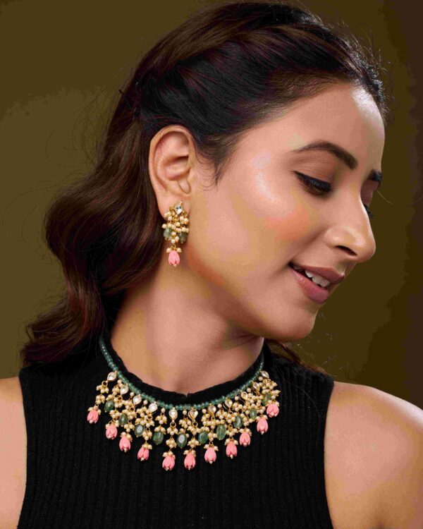 The Kundan Garden Necklace Set is a masterpiece of color, craftsmanship, and luxury. Handcrafted with green beads, white kundan, and lustrous pearls, and adorned with dangling pink floral beads, this eye-catching necklace radiates vibrancy and sophistication.