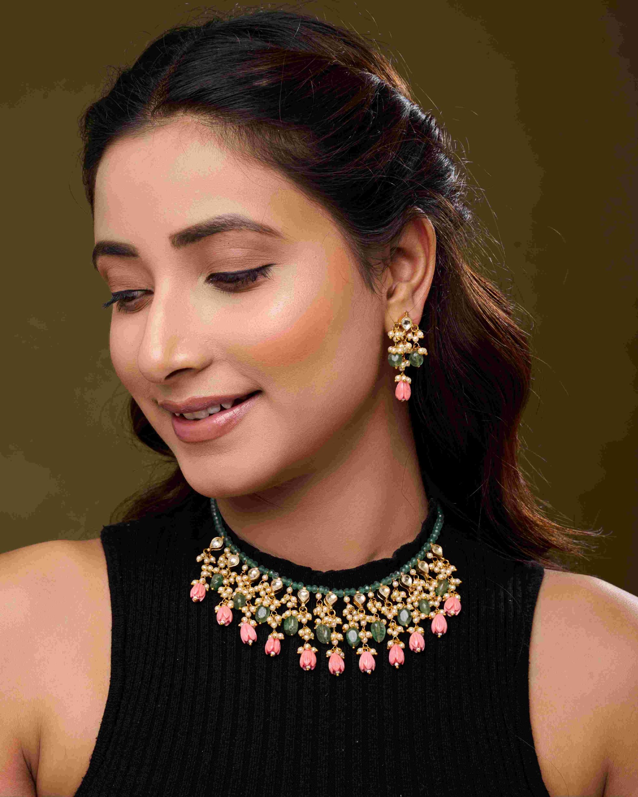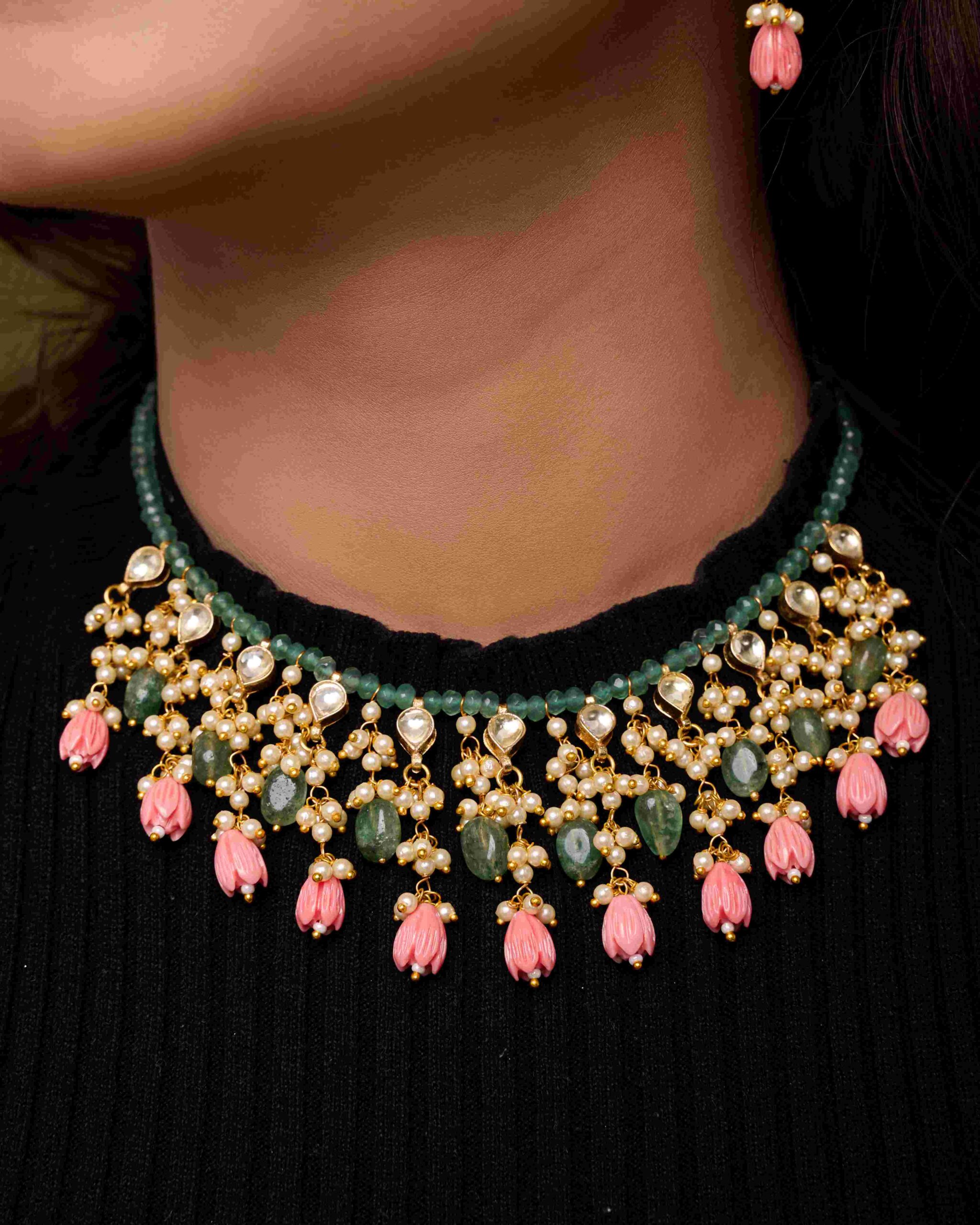 Material: Green beads, white kundan, pearls, pink floral beads, alloy base