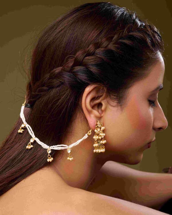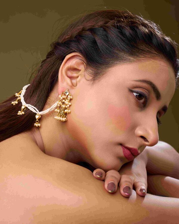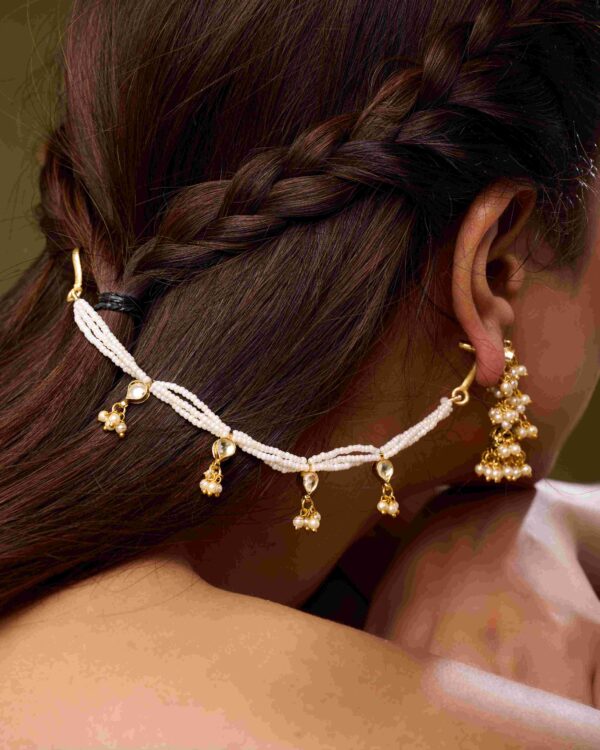 The Kundanita Earchain is a refined accessory that combines subtlety with sophistication. Crafted with a single line of white chid beads and sparkling kundan accents, this earchain adds a delicate yet classy charm to any ensemble.