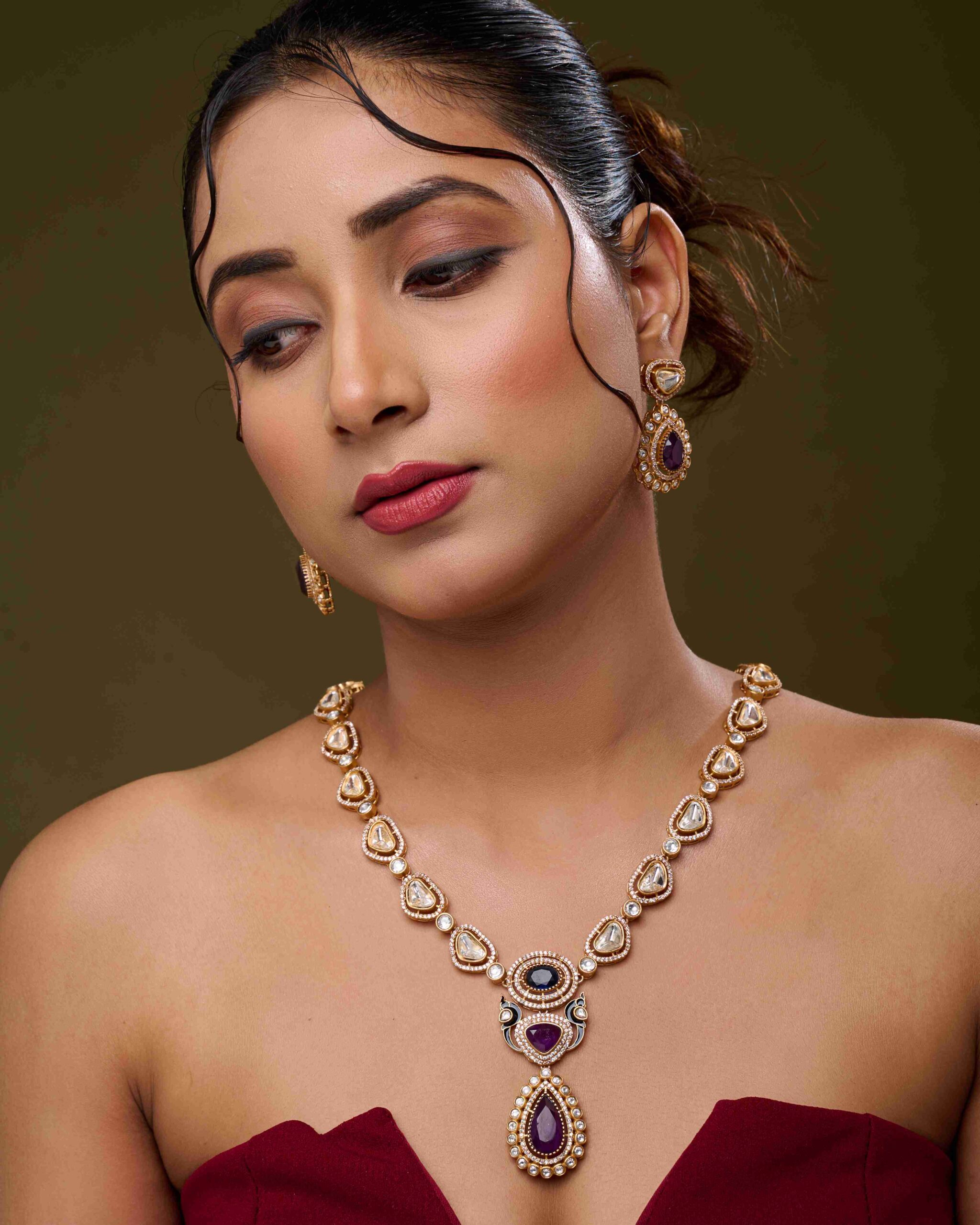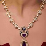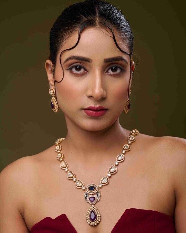 The Majestic Amara Necklace Set exudes sophistication, luxury, and timeless charm. Handcrafted with purple stones and sparkling diamond accents, this necklace radiates a refined elegance that elevates any festive or wedding ensemble.