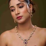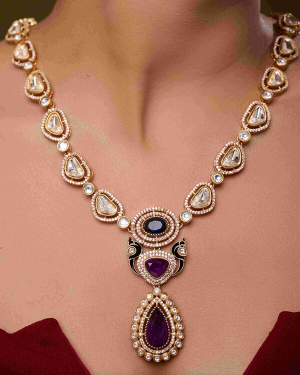 Each stone and diamond is thoughtfully placed to create a harmonious, layered design that drapes gracefully along the neckline. Paired with matching earrings, this set is perfect for weddings, grand celebrations, and cultural gatherings, making every look a statement of opulence and style.