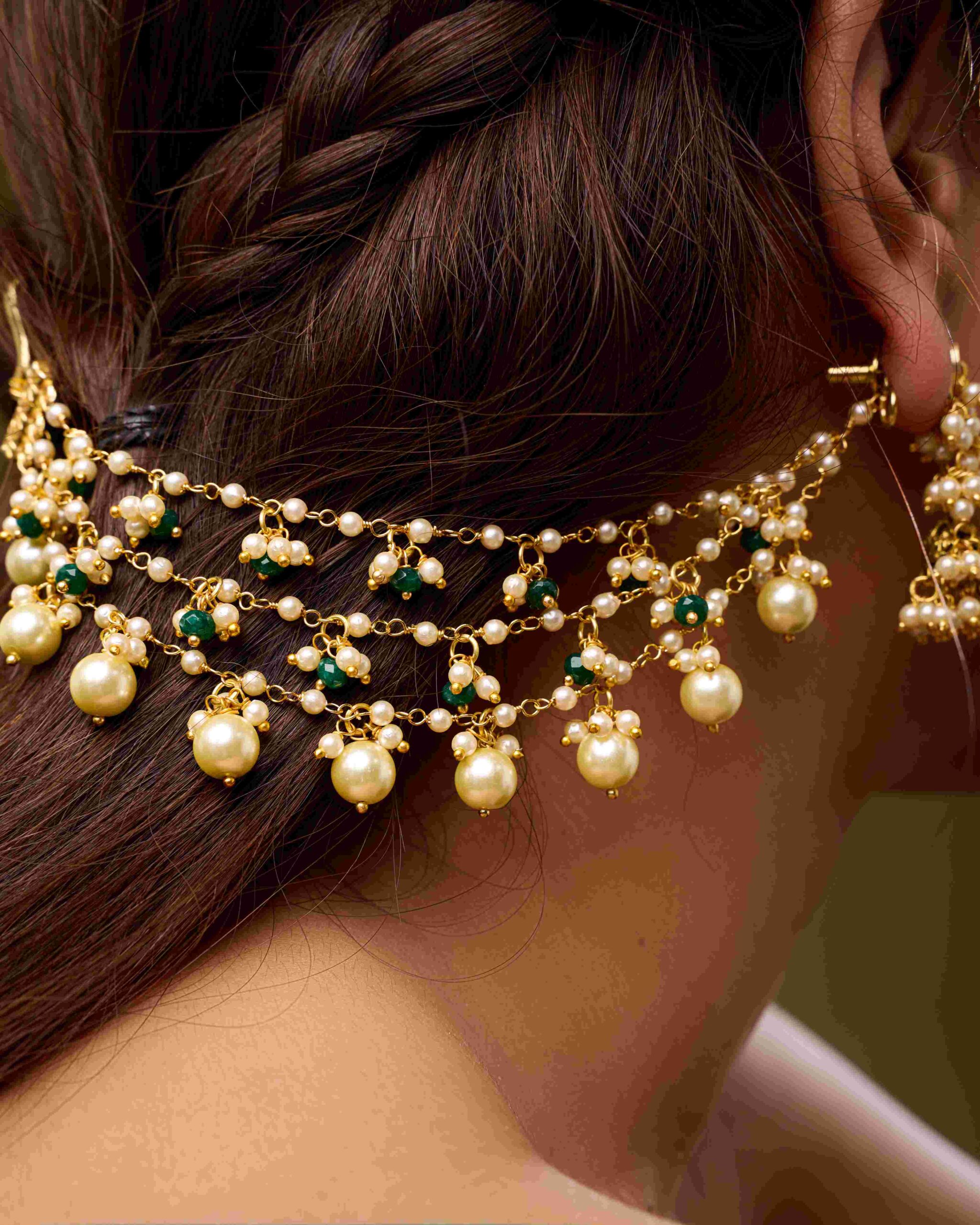 Designed to drape gracefully along the ear, the layered arrangement highlights craftsmanship and elegance. Perfect for weddings, cultural celebrations, or festive occasions, it pairs beautifully with matching necklaces or statement jewelry to complete a regal traditional look.