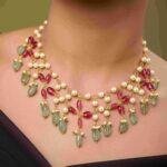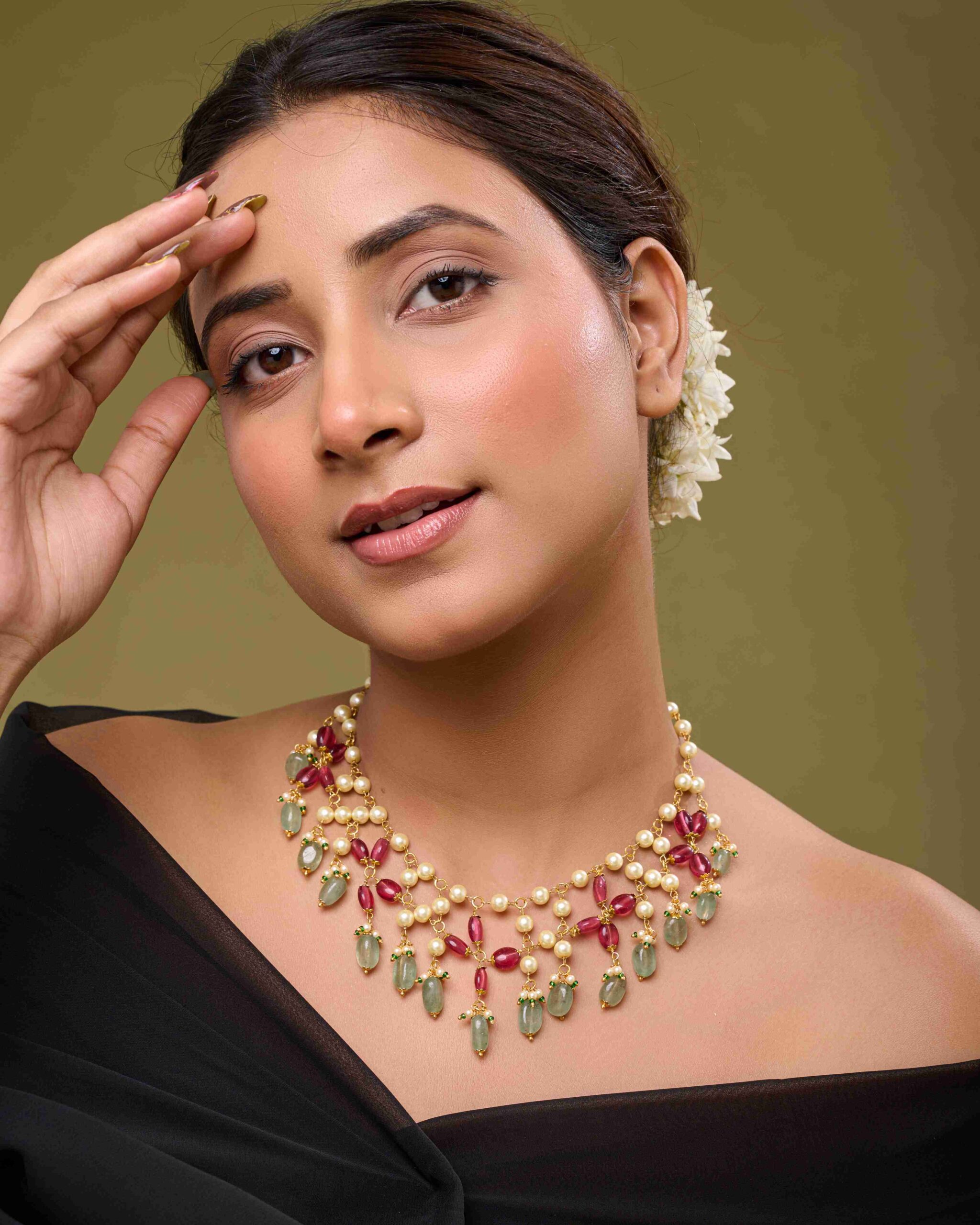 The Moti-Rhodolite Mala Necklace Set is a celebration of artistry, elegance, and vibrant charm. Handcrafted with a thoughtful combination of strawberry green beads, rhodolite stones, and pearls, this necklace exudes a rich, luxurious appeal. Each element is meticulously arranged to create a harmonious interplay of colors, capturing the essence of timeless sophistication.