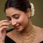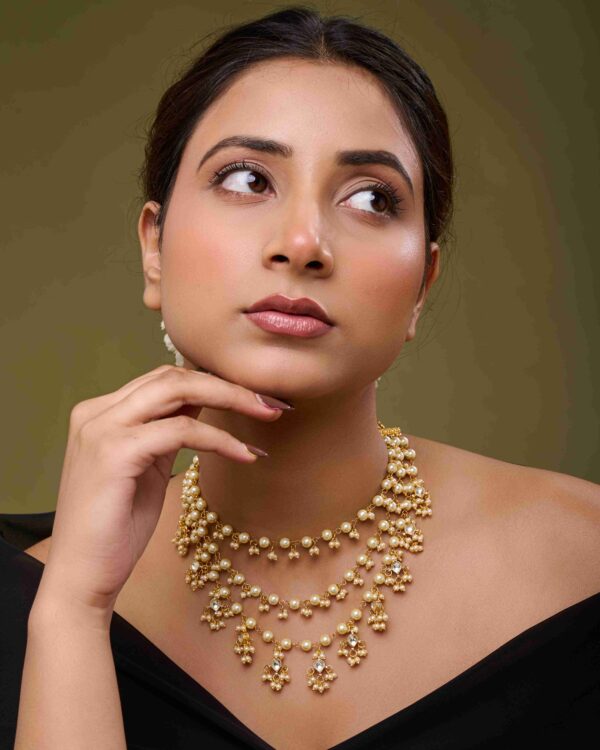 Each strand is thoughtfully layered to create a harmonious balance between the warm glow of gold and the soft shimmer of pearls. Paired with matching earrings, this exquisite set elevates any ensemble, embodying the elegance of royal heritage while maintaining a contemporary appeal.
