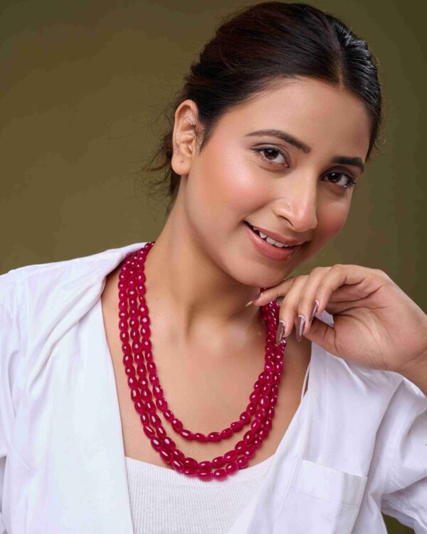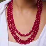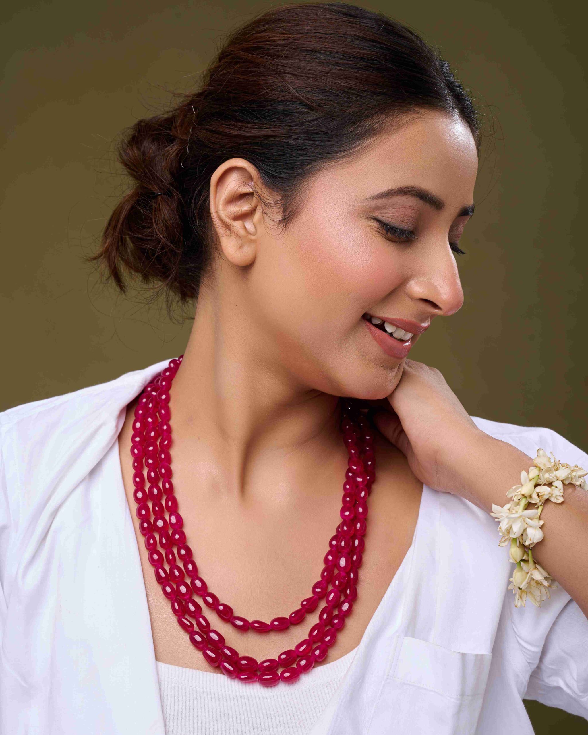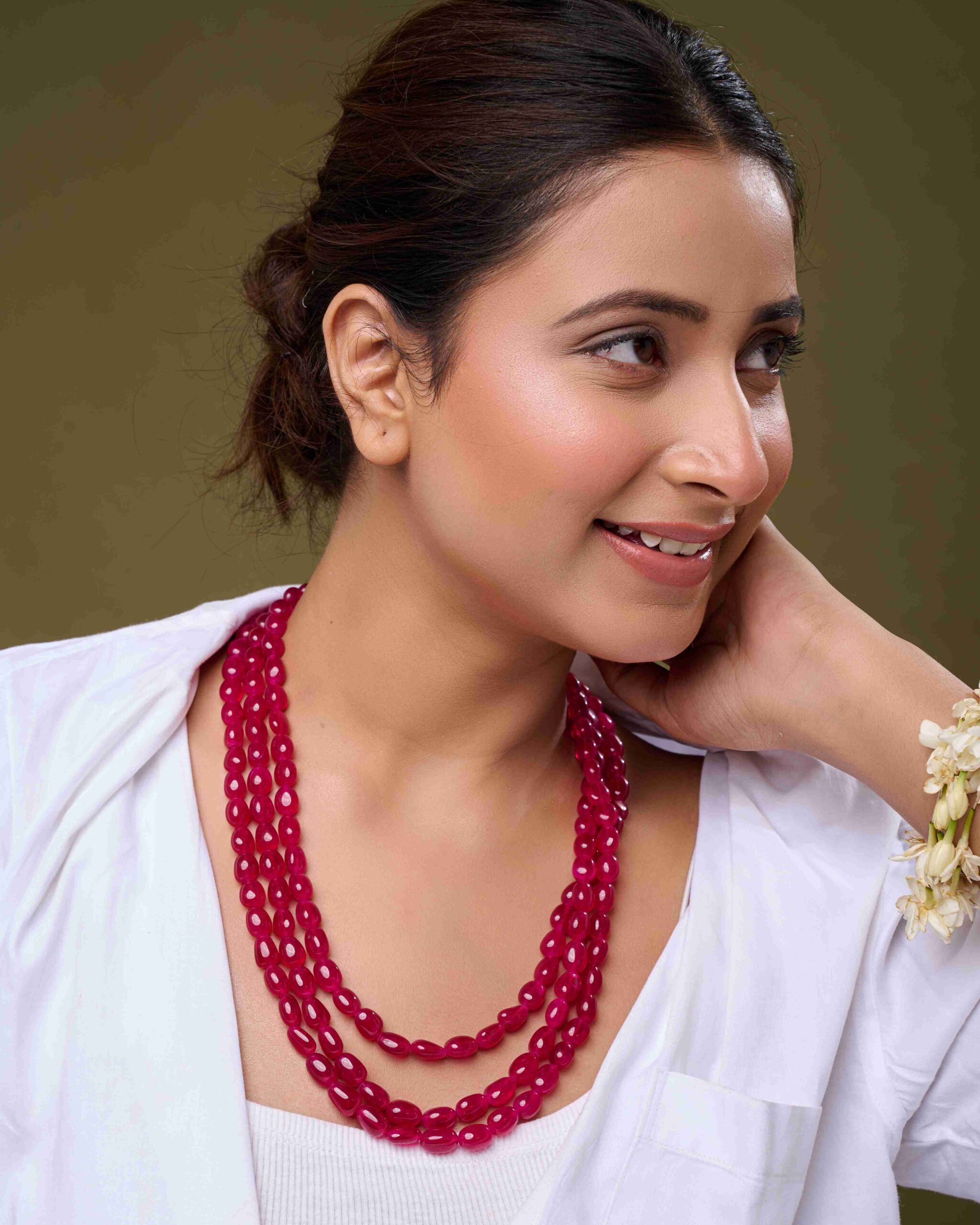 The Ruby Glow Necklace Set exudes luxury and sophistication with its three layers of lustrous red ruby stone beads. Handcrafted with meticulous attention, this necklace captures the fiery elegance of rubies, creating a bold yet refined statement piece for any festive or wedding ensemble.