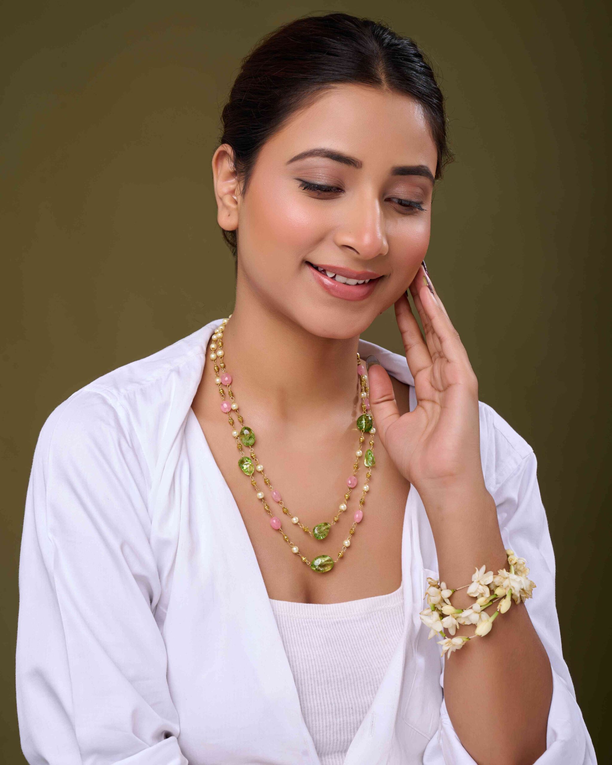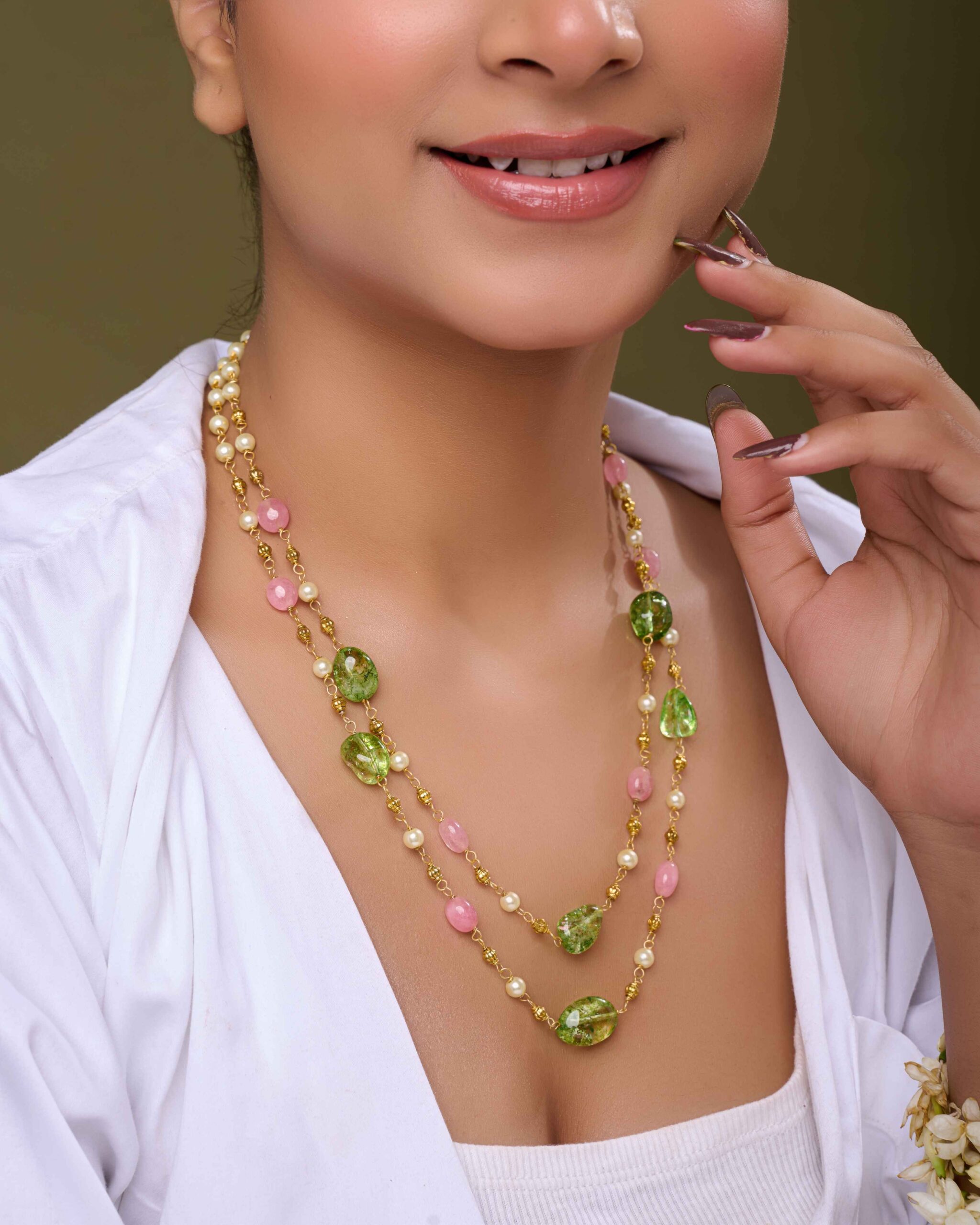 This necklace is more than an accessory—it’s a versatile statement piece that transitions seamlessly from traditional to contemporary styles. Whether paired with an embroidered saree, a pastel lehenga, or a flowing gown, the Tourmaline Layers Necklace adds depth, sophistication, and a touch of heritage charm to your look. Its layered design creates a regal presence while remaining light and wearable for any occasion.
