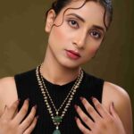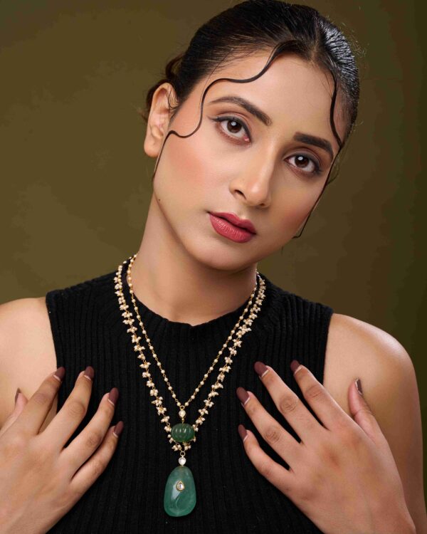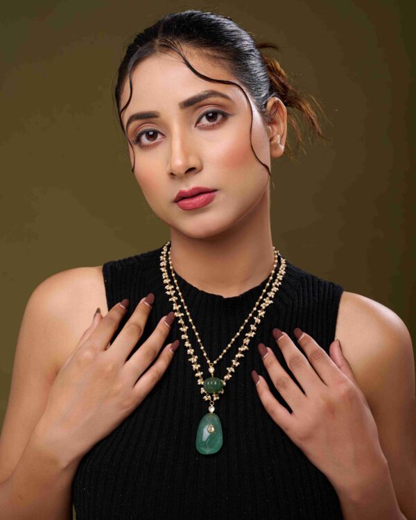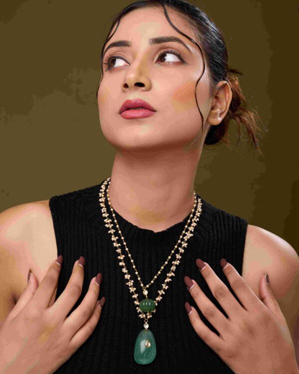 The dual-layer design drapes gracefully along the neckline, offering a delicate yet striking statement. Paired with matching earrings, this set is perfect for weddings, festive occasions, or elegant gatherings, adding a touch of serene radiance to any ensemble.