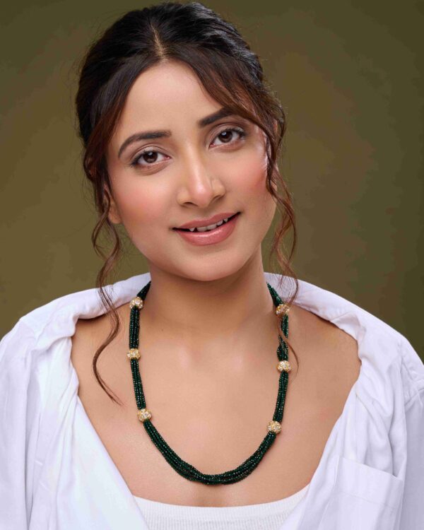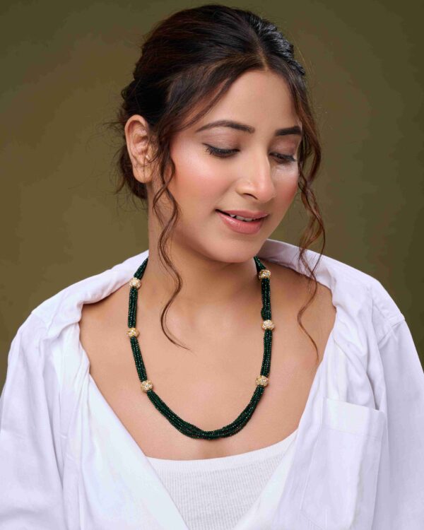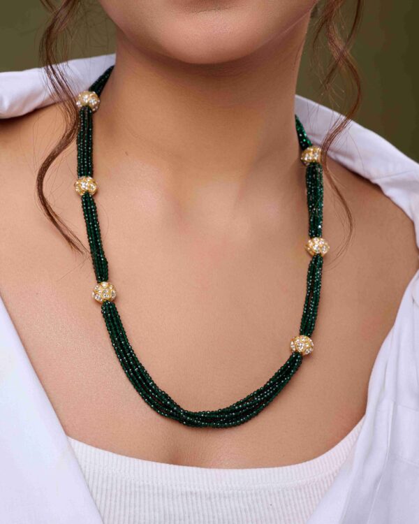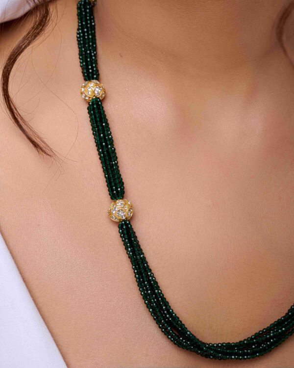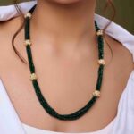 The Zircon Glow Necklace Set blends antique gold beads with sparkling zircon accents, radiating timeless elegance and modern sophistication — perfect for weddings and festive occasions.